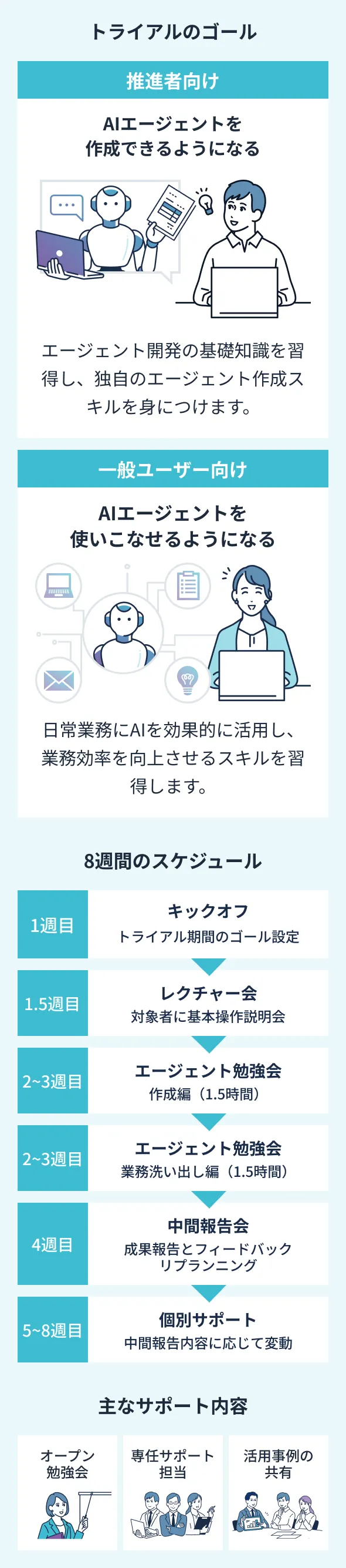 個別相談からトライアル支援、導入後まで一気通貫してサポートいたします。